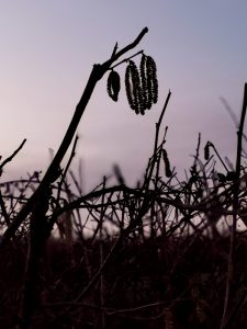 There are ever noticeable signs of Spring sprouting up and around which brings me much joy.  Today I was rather taken by the texture of the male catkins hanging in clusters on the Hazel trees. I hope that these clusters are a sign of a plentiful Hazelnut harvest come Autumn should pollination take place.  The hint of the pink female flowers are starting to show but are yet to be in full bud.